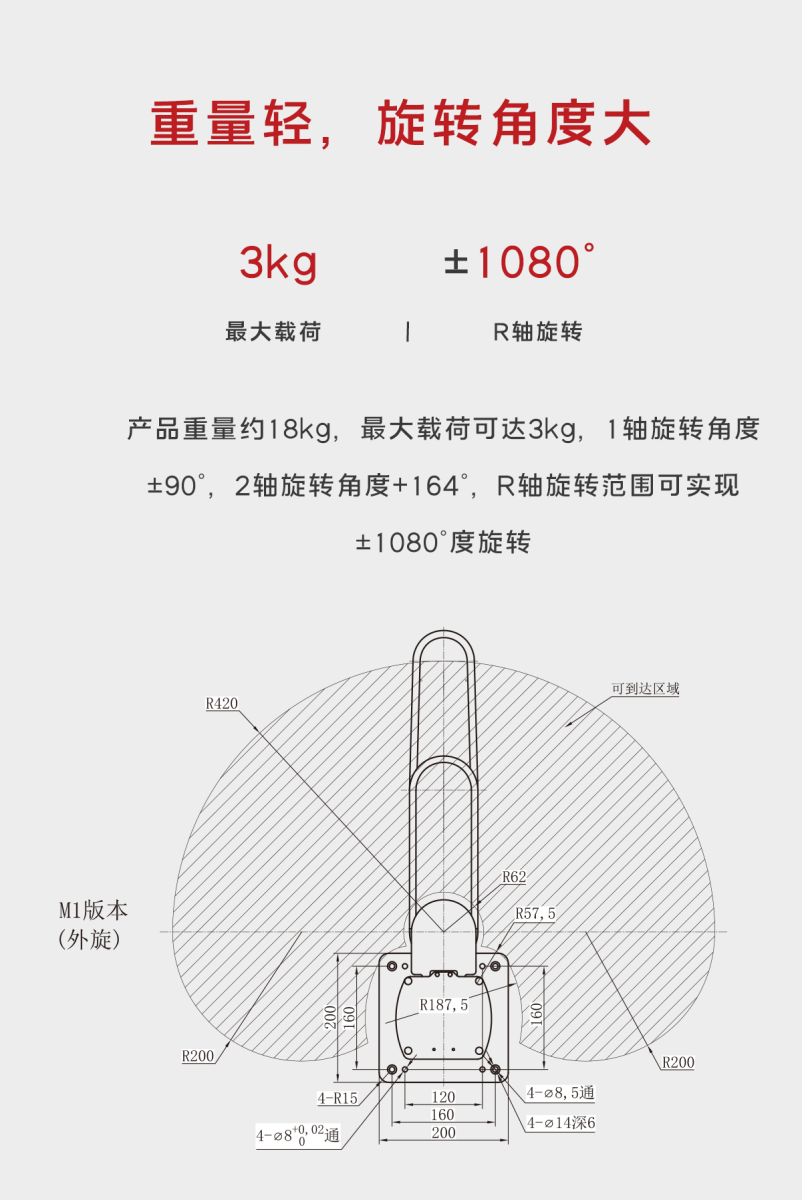 | R軸旋轉(zhuǎn)范圍 | ±1080°無(wú)機(jī)械限位/±170°有機(jī)械限位 |