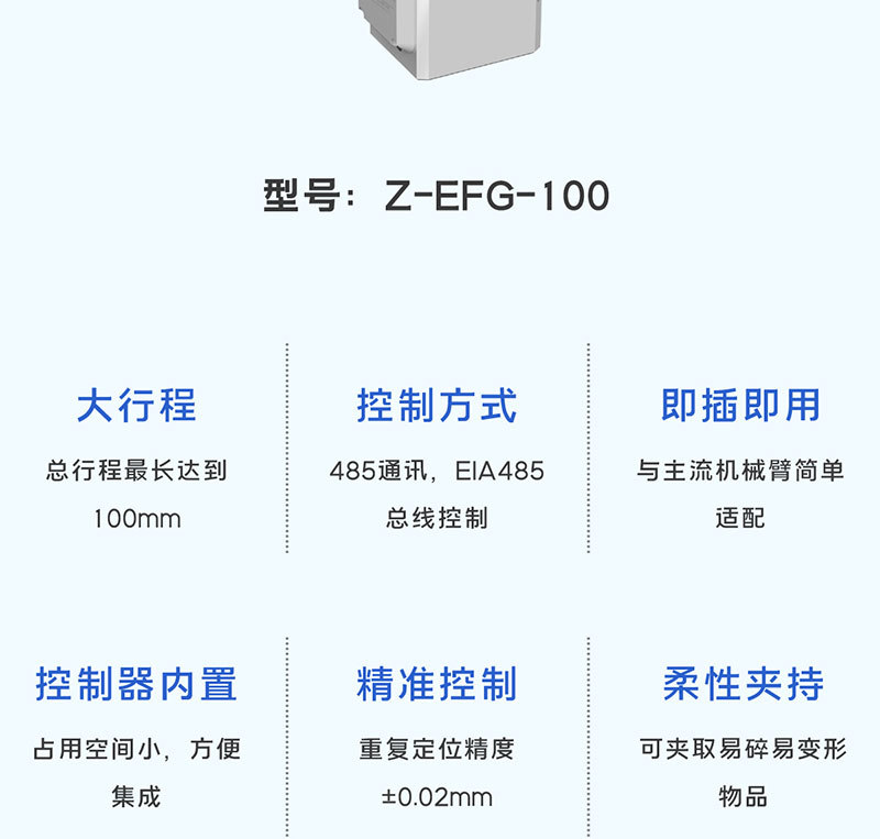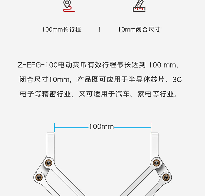 ? ? ? ? 慧靈HITBOT,電動(dòng)夾爪Z-EFG-100,擁有100mm的長(zhǎng)行程,夾持力&行程可調(diào),控制器內(nèi)置,即插即用,有自適應(yīng)抓取,功能強(qiáng)大!
