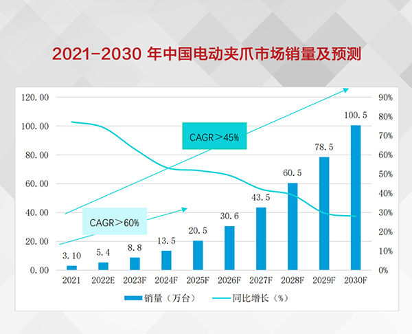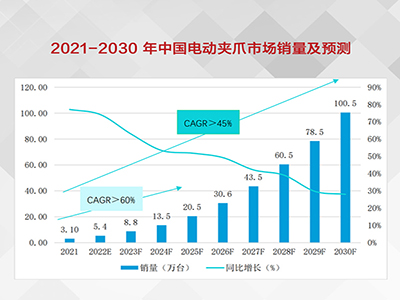 未來5年中國電動夾爪整體銷量年均復合增速將超過60%,未來十年中國電動夾爪整體銷量年均復合增速將超過45%。預計到2025年,國內電動夾爪銷量將突破20萬臺, 到2030年,國內電動夾爪銷量將突破100萬臺。