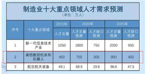 根據(jù)國(guó)家多部門聯(lián)合發(fā)布的未來(lái)制造業(yè)重點(diǎn)領(lǐng)域人才需求預(yù)測(cè)可看出。在2025年,機(jī)器人相關(guān)人才缺口將達(dá)450萬(wàn)!這意味著5年將要增加450萬(wàn)工業(yè)機(jī)器人從業(yè)人員!