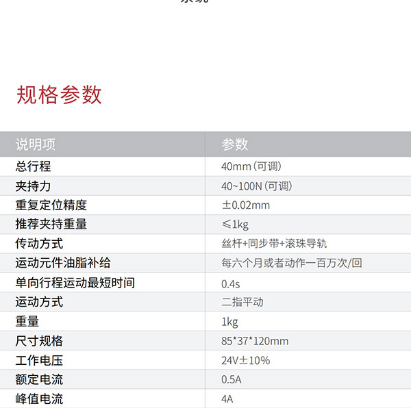 Z-EFG-40-100采用特殊傳動設(shè)計與驅(qū)動算法補償,總行程40mm,夾持力40~100N,行程與力可調(diào),并可實現(xiàn)±0.02mm重復(fù)定位精度,快速響應(yīng), 又快又穩(wěn),適用于狹小的工作環(huán)境!