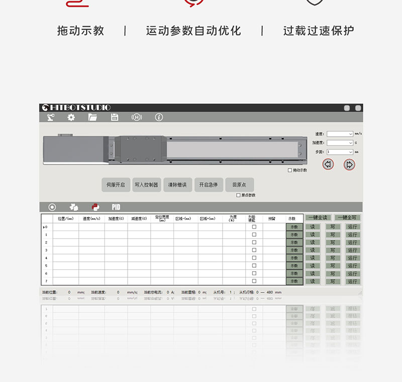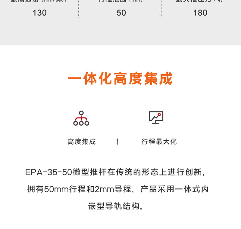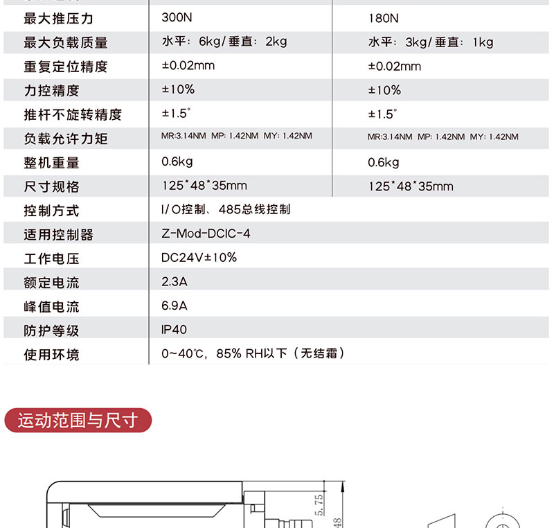 2023年1月7日 Lu, DongWu 智能電缸 0 Z-Mod-EPA-35-50 首頁 / 智能電缸 / Z-Mod-EPA-35-50 微型電動推桿 滑塊結(jié)構(gòu),抗傾覆力強 點擊觀看視頻 微型電動推桿 滑塊結(jié)構(gòu),抗傾覆力強 點擊觀看視頻 產(chǎn)品描述 型號參數(shù) 資料下載 產(chǎn)品描述 Z-Mod-EPA-35-50 核心參數(shù) 2mm 300N? 導程 最大推壓力 50mm ? ? ? ? ? ? ? ? ?3KG 行程 ? ? ? ? ? ? ? ? ? ? ? ? ? ? ? 重復定位精度 *線框尺寸圖 型號參數(shù) 說明項 參數(shù) 行程(mm) 50mm 50mm 導程(mm) 1mm 2mm 最大速度(mm/s) 65mm/s 130mm/s 最大推壓力(N) 300N 180N 最大負載質(zhì)量(kg) 水平:6kg/垂直:2kg 水平:3kg/垂直1kg 重復定位精度(mm) ±0.02mm ±0.02mm 力控精度 ±10% ±10% 推桿不旋轉(zhuǎn)精度 ±1.5° ±1.5° 負載允許力矩 MR:3.14NM MP:1.42NM MY:1.42NM MR:3.14NM MP:1.42NM MY:1.42NM 整機重量 0.6kg 0.6kg 尺寸規(guī)格 125*48*35mm 125*48*35mm 控制方式 I/O控制、485總線控制 適用控制器 Z-Mod-DCIC-4 工作電壓 DC24V±10% 額定電流 2.3A 峰值電流 6.9A 使用環(huán)境 IP40 防護等級 0-40℃,85%RH以下(無結(jié)霜) 資料下載 點擊下載產(chǎn)品手冊 點擊下載3D圖 點擊下載運動范圍圖 產(chǎn)品詳情 相關產(chǎn)品