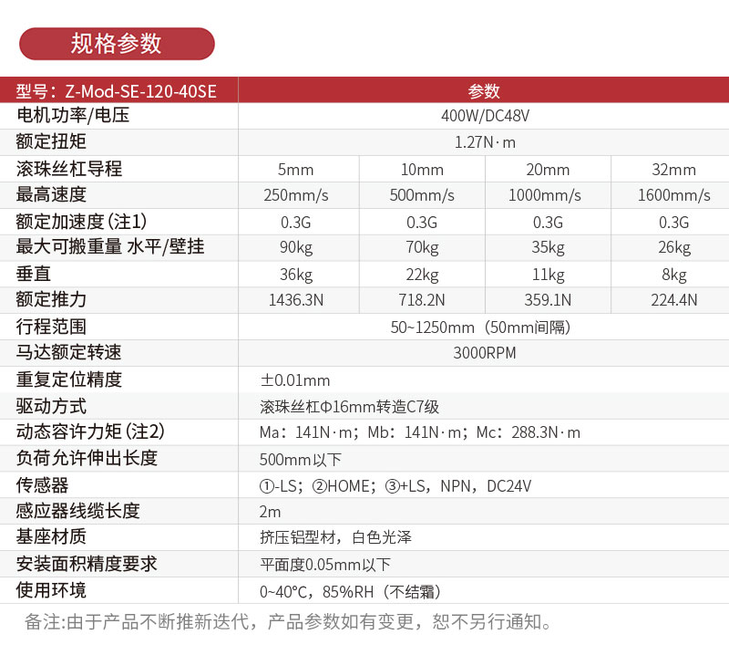 | 滾珠絲杠導(dǎo)程 | 5mm | 10mm | 20mm | 32mm |